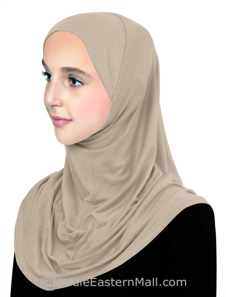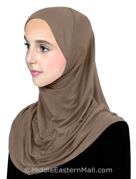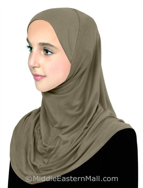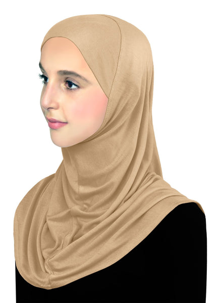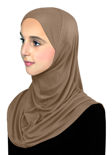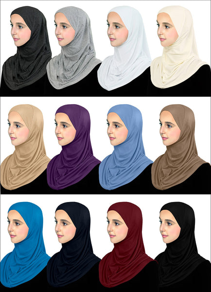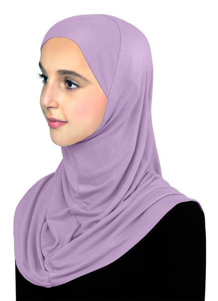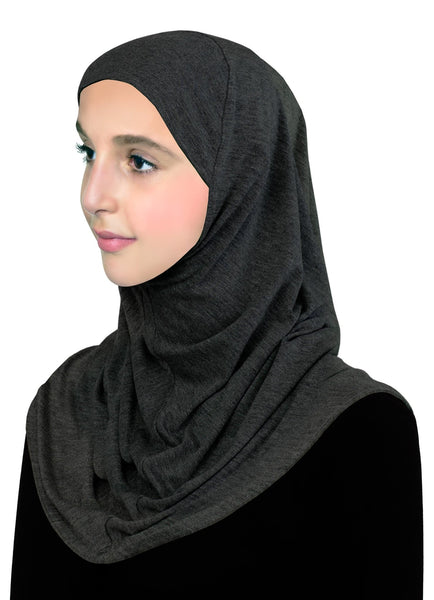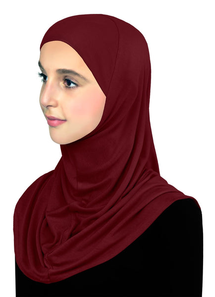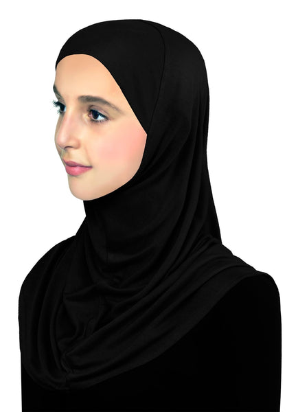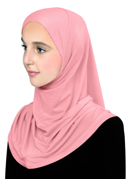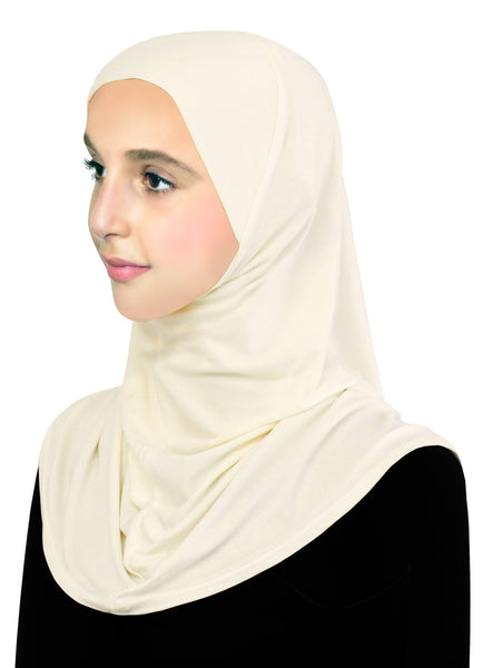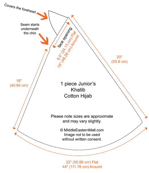 Top-of-the-line quality Khatib Junior's size cotton 1 piece hijab for pre-teen girls and petite ladies is brilliantly comfortable and easy to wear... no pins required. Simply pull it on over the head to wear. It is designed to resemble the 2 piece with the 'headband' forehead section sewn directly into a continuous seam of the 'hood' head and neck covering the opening for the face. The super soft and stretchy fabric is a 95% cotton/5% polyester (spandex) blend.Â