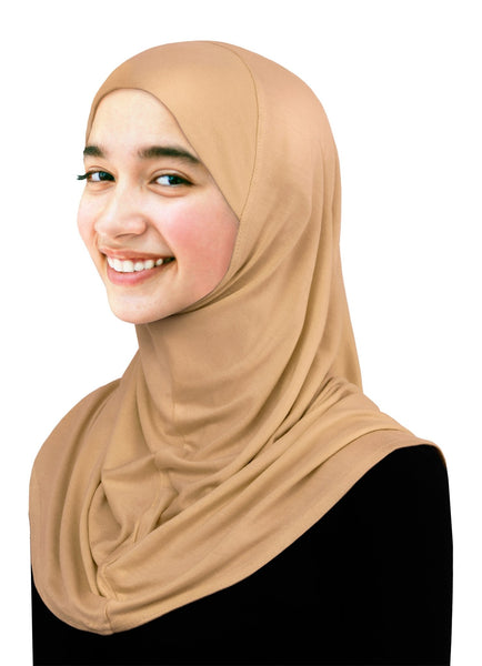The Khatib 1 piece amira hijab in luxurious lycra fabric, which is a polyester spandex blend, that drapes beautifully, is cool, stretchy, and light so it does not add bulk and you can hardly feel it on.